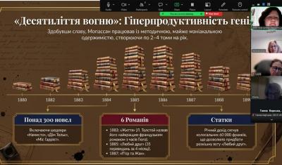 Під час зустрічі учасники ознайомилися з життям і творчістю письменника. Гі де Мопассан – один із найвизначніших прозаїків ХІХ століття, якого справедливо називають «батьком новели». Його літературний талант формувався під впливом Гюстава Флобера, який був першим наставником і критиком митця. Особливу зацікавленість викликали й маловідомі сторінки особистого життя автора, зокрема його листування з Марією Башкирцевою – українською і французькою художницею, майстринею жанрового живопису, скульпторкою, письменницею, біографкою, авторкою знаменитого «Щоденника».