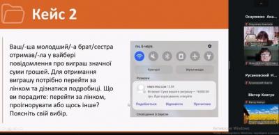 Під час зустрічі підлітки працювали з практичними кейсами, що охоплювали найпоширеніші онлайн-ризики: фішингові повідомлення, небезпечні покликання, псевдорозіграші, шахрайські сайти, загрози під час онлайн-знайомств, злам акаунтів та правила безпечного користування банківськими картками. Окрему увагу приділили поняттю фішингу, ознакам маніпулятивних повідомлень (емоційність, вимога діяти негайно, «надто вигідні» пропозиції), а також важливості критичного мислення в цифровому середовищі.