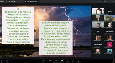 Особливої напруги й емоційної глибини додало читання поезії «Тиша і грім» – твору про пробудження людини, про тишу, що може вбивати, і грім, який повертає до повноти життя. У цій поезії кохання постає як совість, а внутрішній грім – як символ духовної свободи.