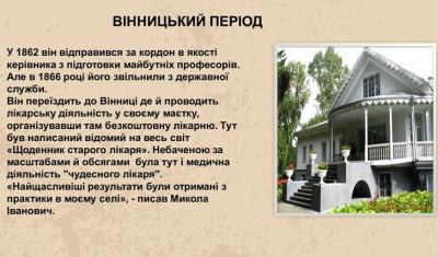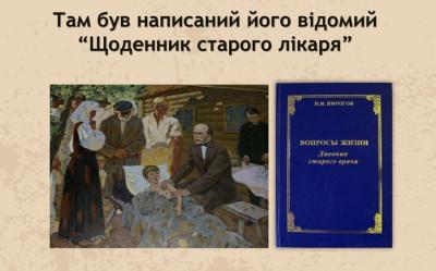У розквіті творчих сил Пирогов усамітнився в своєму невеликому маєтку «Вишня» неподалік Вінниці, де побудував гарний будинок, аптеку, лікарню та насадив екзотичні рослини. Жив за чітким розпорядком: прокидався на світанку, робив довгу пішу прогулянку, чай, робота в саду, у стайні чи птахівниці. Далі – огляд хворих, прийом пацієнтів. Заробляючи до кінця своїх днів медичною практикою, Микола Іванович двічі на тиждень з восьмої ранку до восьмої вечора приймав бідняків безкоштовно. Після операції він завжди ховав руки в кишені, щоб йому не надумали платити. Для успішного спілкування з місцевим населенням Микола Іванович вивчив українську мову, яку використовував у повсякденній роботі. Це був дійсно гуманіст з великої літери.
